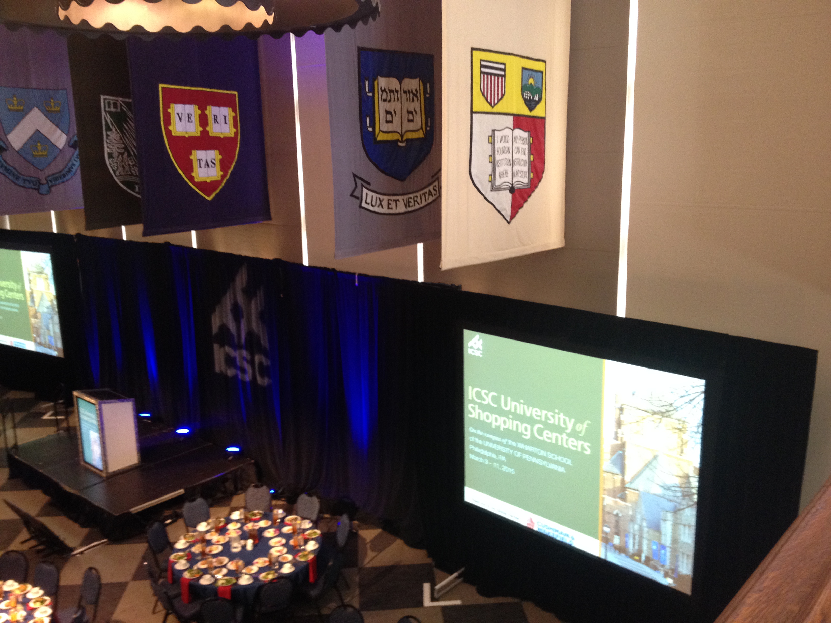 School crests from the colleges of the Ivy league with alma mater flag in foreground.